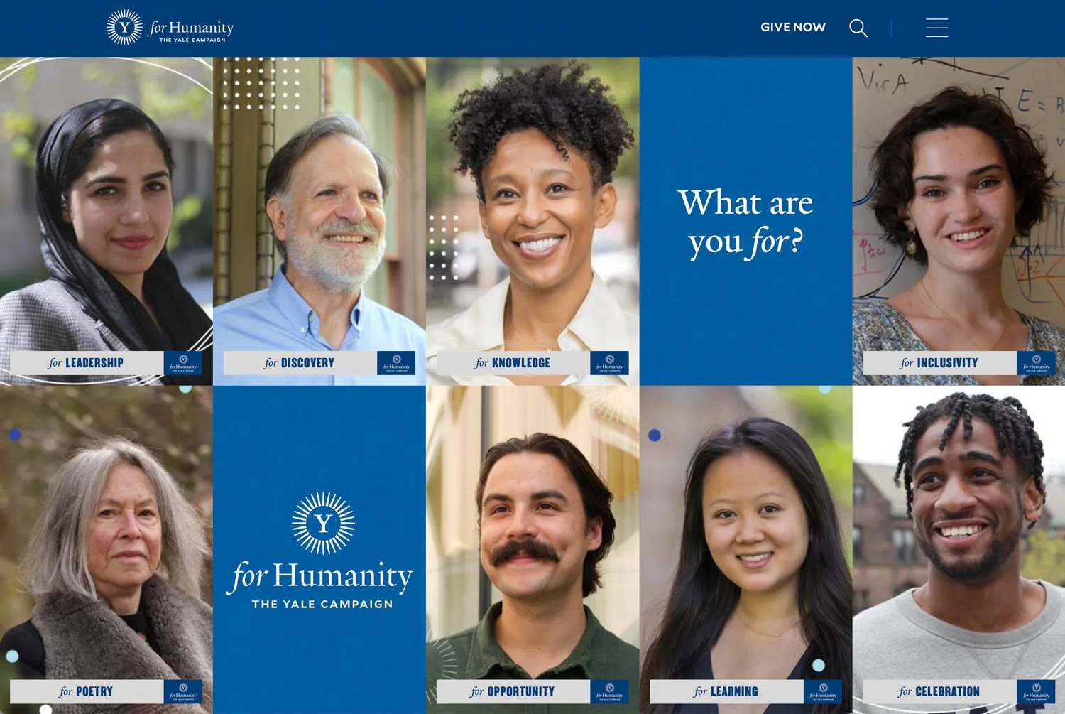 Starting with the development of their comprehensive campaign, For Humanity, we explored all the ways in which Yale moved the world forward. Across the sciences, arts, humanities, tech, politics, built environment and even forests, Yale has consistently produced the people who go on to make the world brighter, bolder and more vibrant. This campaign’s job was to not just celebrate those accomplishments in equal measure, but to also communicate their profound impact and necessity.